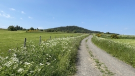 Lorsque le sentier se divise, nous choisissons évidemment celui que nous ne connaissons pas. Il nous mène sur une route gravillonnée qui ne semble jamais finir. Derrière nous, le versant sud du puy de Monténard.