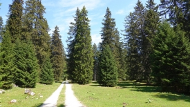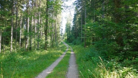 Nous marchons gaiement sur une belle route forestière. Les arbres nous protègent du soleil et la température est agréable.