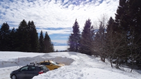 Le parking du Sapin à Siméon n’a qu’une place de libre, dans laquelle se faufile notre canari jaune.
