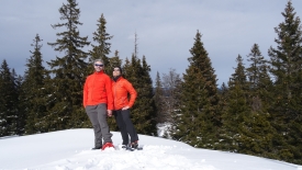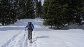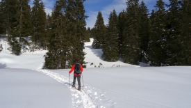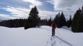 Et c’est parti ! Un pas après l’autre, je suis à la trace Stefano. À peine a-t-il levé sa raquette que la mienne se pose dans le trou qu’il a ménagé. Nous montons ainsi face à la pente. En 15 minutes, nous gagnons 80 mètres au prix de quelques respirations bruyantes et d’une belle suée. Un sacré raccourci, dira Stefano. Il ne nous reste plus qu’à nous diriger tranquillement vers le Crêt de la Neuve.