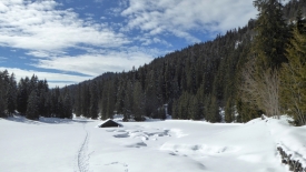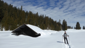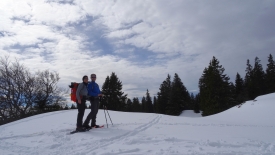 À notre grande surprise, l’épaisseur de la couche de neige fraîche est la même que celle que nous avons reçue en plaine. La neige est un peu lourde et mouillée car il semblerait bien qu’hier il ait plu.