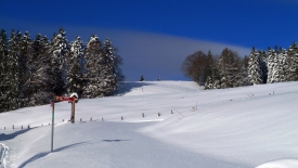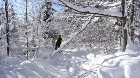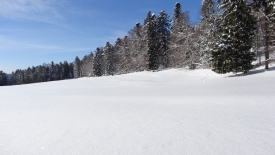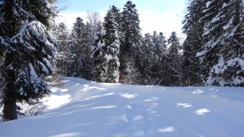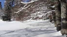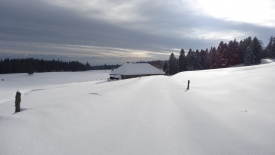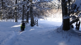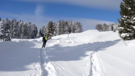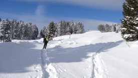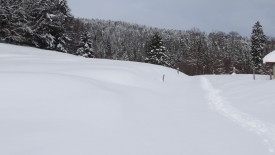 Toutes les bonnes choses ont une fin… Le tracteur a dû en avoir marre de déneiger et a donc stoppé net… Nous nous retrouvons dans la poudreuse. Heureusement pas pour longtemps car nous retrouvons une trace… Une trace de ski. C’est décidé… Plutôt que de monter aux Chenevières, nous allons les suivre. Stefano prédit qu’elles vont nous conduire à la Pessette.