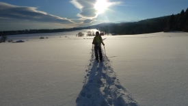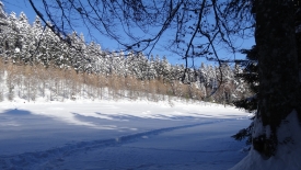 Nous marchons ainsi, à flanc de montage pendant près de 1.8km. C’est super agréable… Le terrain est plat, la neige douce, le soleil franc et la trace nous permet de progresser avec un minimum d’effort. La belle vie quoi !
