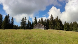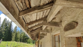 Nous arrivons au Pré Derrière, un chalet désert, au magnifique pan de toit recouvert de tavillons.