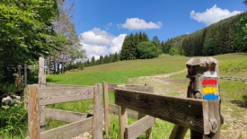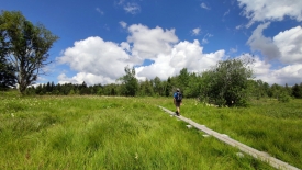 Un petit sentier, composé de deux planches de bois posées sur des plots, garde nos pieds au sec et surtout empêche que nous abîmions la prairie.