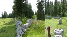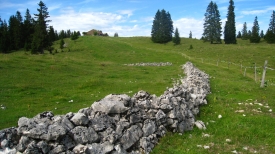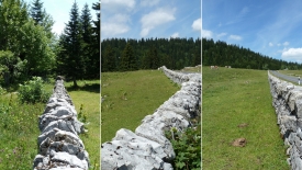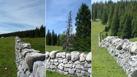 Un mur en pierre sèche séparant les pâturages du Joux de Bière et de la Sèche de Gimel. Lequel des deux pâturages est le mieux entretenu d’après vous ? Observez la différence … Devant : tout propre. Au fond : tout caca !