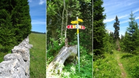 Prochaine étape, la Sèche de Gimel. Nous traversons une partie des Bois du Marchairuz, puis empruntons le sentier qui descend vers les Amburnex.
