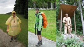 Et le deuxième événement, est le retour de Ponchoman, toujours aussi joyeux de marcher sous la pluie ! Avez-vous remarqué la grimace (1) ? Madame est plus stoïque face aux événements qui échappent à notre volonté (2) tandis que Monsieur Anonyme, lui, s’en fiche royalement, bien à l’abri sous son toit (3). Vu le style nous nous disons que c’est sans doute le même artiste qui a sculptée celle de Siméon, vue à l’aller.