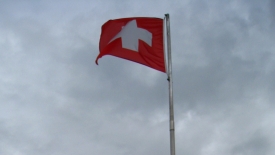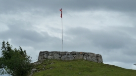Le drapeau de la Mère Patrie flotte sur le Crêt de La Neuve, alors que le ciel se fait de plus en plus sombre et menaçant.