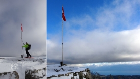 Son drapeau ne flotte pas au vent car il s’est enroulé sur lui-même. Stefano tente bien l’impossible mais… trop petit (1) ! Ce n’est pas grave, flottant ou pas, la croix suisse se détache joliment dans le ciel bleu (2) (ou plutôt devrais-je dire, le trou de ciel bleu).