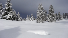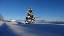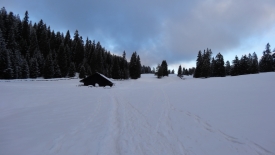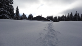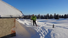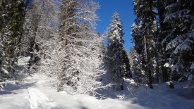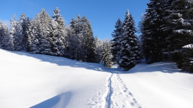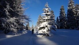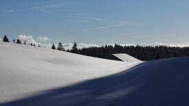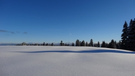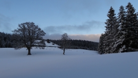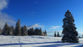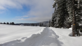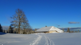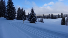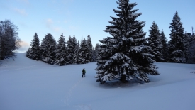 Nous traversons le sentier des Crêtes du Jura et redescendons vers la Combe des Amburnex. Mauvaise surprise… Nous ne savions pas que le coin était un repère de skieurs de fond. Il va falloir éviter les pistes, amoureusement tracé par le ratrack que nous entendons au loin.