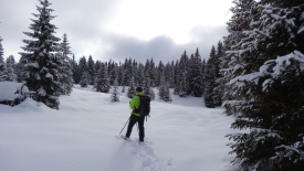 Nous croisons un troupeau en raquettes. Une douzaine de personnes. L’une d’entre elles ne connaît pas la notion de Leave no Trace. Un vilain mouchoir en papier souillé trône non loin d’un trou jaunâtre dans la neige. Dommage…