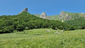 Dans la vallée, avec, en fond, des aiguilles de lave, des dykes et la crête des puys du Sancy.