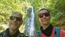 Nous dépassons quelques randonneurs, surpris par l’inclinaison de la pente. Je me félicite d’avoir trempé mon teeshirt dans un des ruisseaux. Puis, le sentier s’arrête net. Sur la gauche, un bruit d’eau et un replat. Nous nous penchons et apercevons la cascade qui, entre nous, ne nous laissera pas un souvenir impérissable. En faisant fi de l’interdiction d’aller plus loin, nous aurions certainement pu trouver un meilleur point de vue. Encore que…