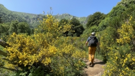 Nous choisissons d’aller découvrir la cascade du Moine. Le sentier suit le fond de la vallée, traversant de nombreux ruisseaux. Les pâturages disparaissent et laissent place à une végétation d’arbrisseaux comme le genêt à balais et le noisetier.