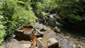 Nous prenons gentiment le chemin du retour. Après le passage d’un pont ou le torrent La Biche devient la Couze de Chaudefour, Stefano m’entraîne vers un sentier perpendiculaire. Nous arrivons au bord du torrent où un petit bassin de pierre déverse de l’eau par un tuyau métallique rouillé : la source Sainte Anne.