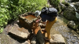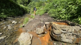 Les dépôts qu’elle y laisse sont d’une belle couleur orangée. Je parviens à trouver une explication quant à l’origine de cette eau. L’eau de pluie s’infiltre et se réchauffe en s’enfonçant sous terre, se chargeant de sels minéraux dissous. Ici, en région volcanique, le gradient géothermique est de 10 degrés par 100 mètres. Elle s’approche du magma, peut-être 20 km plus bas, et se charge en gaz carbonique avant de remonter vers la surface à la faveur d’une fracture dans la roche. Ce cycle s’étale sur une période de plusieurs siècles, voire de milliers d’années.