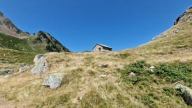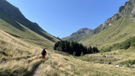 Il s’ensuit une belle ascension par un sentier parfois défoncé, et, 300 mètres de dénivelé plus tard, nous sommes en vue de la Cabane dets Coubous, une cabane non gardée et toujours ouverte, à priori. Nous rencontrons un charmant couple de Bretons qui rentre d’un périple de 5 jours en autonomie complète. Ils ont encore des étoiles dans les yeux des nuits passées en pleine nature. Ils n’ont pas consommé tout le pain qu’ils avaient emmené avec eux et nous confient qu’ils privilégient les oléagineux et la semoule de blé dur (ce que nous appelons le couscous) car calorique et vite préparée avec un peu d’eau bouillante. Nous notons ça dans un coin de notre tête.