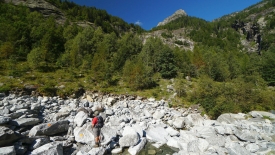 Nous traversons le fiume Calnègia, suffisamment large pour que l’eau, bien répartie, soit aisément franchissable. La suite de la balade va se faire en suivant le ri della Crosa, ruisseau, ou plutôt torrent qui s’échappe des lacs que nous convoitons.