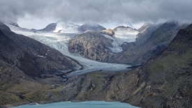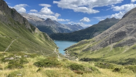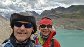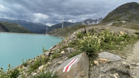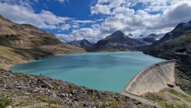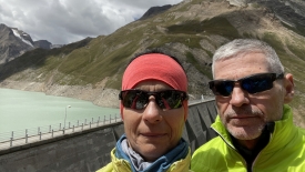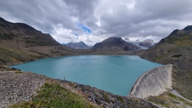 Monsieur Météo nous avait promis un ciel bleu sans nuage mais une fois de plus il s’est gaussé de nous. Nous sommes arrivés aux éoliennes et avons une vue plongeante sur le Griessee et son barrage. Au fond, le glacier du Gries.