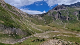 Parvenus au niveau de l’alpe Bättelmatt, un sentier monte vers un refuge, le rifugio Città di Busto. Le bétail est très occupé à brouter l’herbe, encore un tant soit peu verte. Au centre de la photo ci-dessous, le col du Gries, d’où nous venons.
