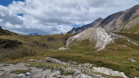 Sur notre gauche, la vallée où coule le rio del Sabbione. En suivant la crête où se perd le sentier, on aperçoit le rifugio Città di Busto.
