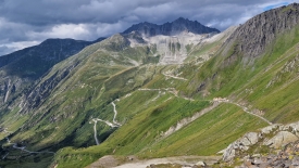 Les lacets de la route du col du Nufenen, si prisés par les motards et autres conducteurs de voitures sportives. La route permettant l’accès aux éoliennes, pour la maintenance, est celle qui lacère la montagne à droite. Nous voyons qu’effectivement un pierrier s’est laissé aller et a déversé quelques cailloux sur la route. Pas de quoi en faire un fromage, quand même !