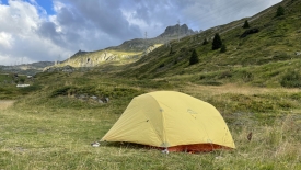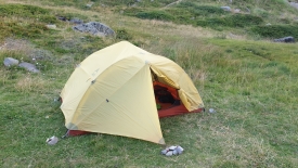 Le vent est bien présent également et malmène le tissu léger. Hum, la nuit promet d’être animée. Nous plaçons le réchaud à l’abri de l’auvent. Au menu ce soir, du riz et poulet au curry. Il ne faut que 8 minutes au mélange pour se réhydrater. Je tremble de froid, malgré la doudoune et la Gore-Tex. Nous rentrons manger dans la tente. Le mélange est excellent. L’essayer c’est l’adopter. Les dents brossées, je m’enfile dans le sac de couchage à la rechercher de chaleur. Stefano ne tarde pas à me rejoindre. Le vent fait claquer la toile. Nous nous laissons doucement emporter par le sommeil…