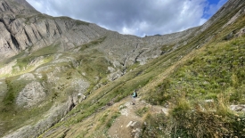 Le plateau se termine et le sentier prend soudain de l’altitude. Il se fait étroit et s’accroche sur le flanc de la montagne, parallèlement à la crête. Les deux vététistes soulèvent leur vélo et les calent sur les épaules pour négocier la première centaine de mètres, impraticable sur deux roues. Elle est toujours devant.