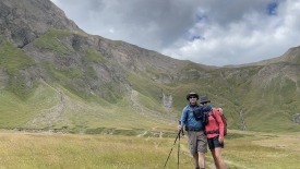 Arrivés au col du Gries, le sentier descend abruptement. Le paysage est minéral. Le sens des strates témoigne des pressions gigantesques qu’elles ont subies. Nos deux cyclistes nous rejoignent. Elle, sourire aux lèvres, descend sur son vélo, visiblement très à l’aise. Lui, loin derrière, est à pied, retenant difficilement le vélo dans la descente. J’aime !