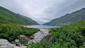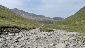 A partir de là, la voiture se trouve à 4 km. Il y a d’abord l’arrivée au Passo dell’Uomo, puis la descente par la piste jusqu’au lac – piste que nous trouvons au moins aussi désagréable que lors de notre retour du Val Cadlimo – puis la piste qui longe le lac. L’euphorie des premiers jours et l’excitation des découvertes se sont dissipées et nous sommes plutôt contents d’arriver au parking. Le manque de soleil s’est cruellement fait sentir.