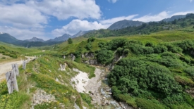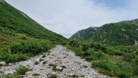 Tout va bien jusqu’à ce que le sentier ne disparaisse dans un pierrier, vraisemblablement créé par un éboulement de terrain. Les derniers mètres se font à l’aveuglette, dans les hautes herbes, où nous mesurons avec précaution chaque pas, afin d’éviter l’entorse que pourrait causer un rocher dissimulé.