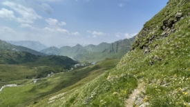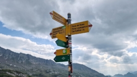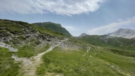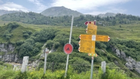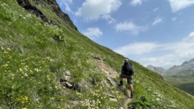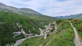 Il nous faut prendre encore un peu d’altitude, pour rejoindre la croisée des trois sentiers, chacun partant vers un col : Passo dell’Uomo, Passo delle Columbe et enfin Passo del Sole. De l’autre côté du torrent, nous discernons le sentier où nous étions ce matin, juste après avoir franchi le pont.