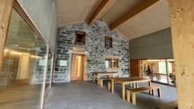 Les anciens murs ont été conservés et une grande cour couverte ajoutée, en plus de chambres et de cuisines. Nous commandons un grand café. Installés d’abord dehors, sur la terrasse, le froid ambiant nous chasse à l’intérieur.