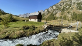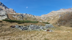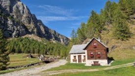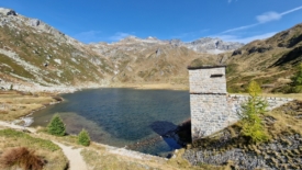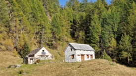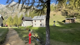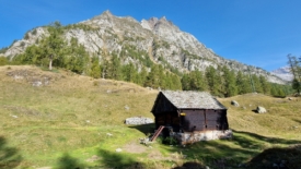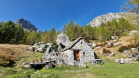 Le sentier qui descend vers le lac mène vers une construction, constituée d’une étable qui peut être a été aménagée en abri ou en refuge et d’une table de bois. La porte est verrouillée. L’endroit s’appelle Larecchio.