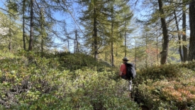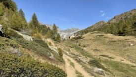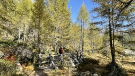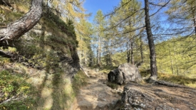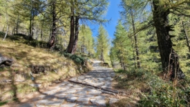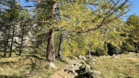 Ici nous somme à Cantone, au nord du village principal. Un sentier s’en échappe et court à travers les mélèzes.