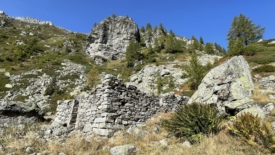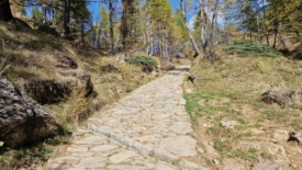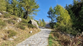Le sentier qui y mène – mais peut-on parler ici de sentier ? – est pavé. Nous marchons en effet sur un bout de la Via Albrun (ou Via dell’Arbola), cet ancien chemin muletier qui reliait la vallée de l’Ossola (autrefois appelée Eschental par les Walser) à la vallée de Binn, dans le Haut-Valais, par le Col de l’Albrun (ou Bocchetta d’Arbola). On pense que c’est par ce col que les Walser sont arrivés dans l’Ossola, alors que ceux qui s’étaient installés dans le Val Formazza, seraient passés par le Griesspass (ou passo del Gries).