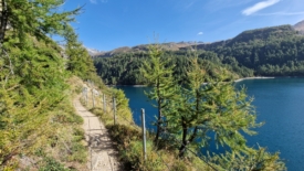 Le bout de lac est maintenant visible. Le sentier prend un peu de hauteur et bien qu’il reste large, s’est vu doté d’une barrière afin que l’itinéraire puisse être à la portée de tous.