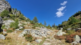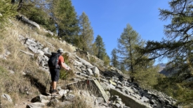 Les passages dans les mélèzes alternent avec des traversées de pierrier.