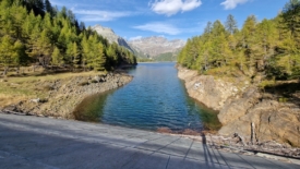 Deux jeunes hommes, appareils photos en main, cherchent le meilleur angle. Leur but diffère. L’un est plutôt intéressé par capturer le cerf qui brame, non loin, sur le flanc encore boisé du Pizzo Fizzo. L’autre, accroupi, ou plutôt assis sur ces talons, attend, immobile, l’objectif pointé vers le lac, qu’un poisson saute pour tenter de ferrer l’instant. Ils sont opportunistes, nous disent-ils. Nous sommes ici pour faire de la photo. Nous verrons ce que nous arrivons à récolter.