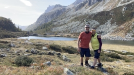De l’autre côté du lac un couple de randonneurs vient s’incruster sur nos photos. Lui porte un tee-shirt jaune canari, difficile à ignorer.