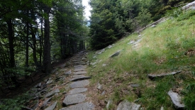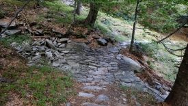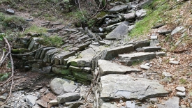 Le sentier se rapproche du ri de Sascòla. Alors que nous sommes arrivés à Corte del Lago après une longue traversée, le sentier descend très très vite par une pente très très raide. Si les marches sont plus rares, les traversées de petits rus sont aménagées de manière à résister à la pression de l’eau.