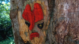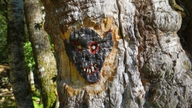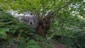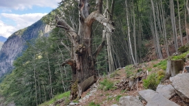 Parmi les sapins, des châtaigniers aux troncs imposants. Celui-ci n’est pas mort, contrairement à ce que l’on pourrait croire. Une ou deux branches sont encore garnies de belles feuilles denses.