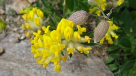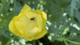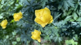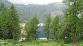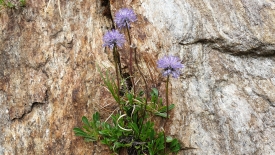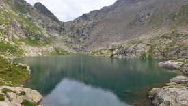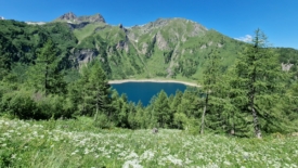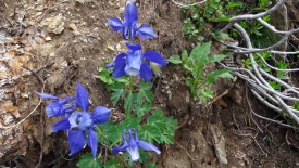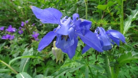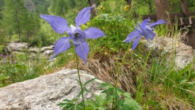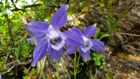 Le côté sud du lac est sous les falaises et la végétation beaucoup plus luxuriante que son côté opposé. Les ancolies des alpes ont colonisé les pentes, se mélangeant avec les géraniums.
