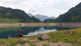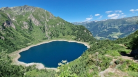 Notre marche est rythmée par le son des clarines des vaches, groupées près de l’étable, en bas, au bord du lac.