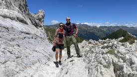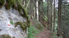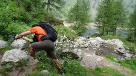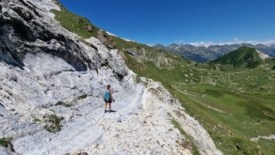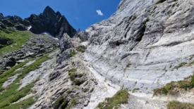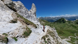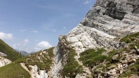 Il faut de temps en temps s’aider des mains et, parfois, éviter de regarder au-delà du bord du sentier, vers le vide. Une portion de sentier suit une veine de dolomie, blanche comme neige et brillante comme de la glace.