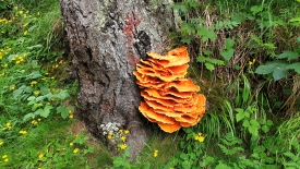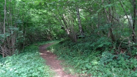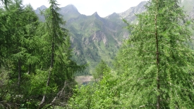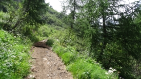 Après une courte marche dans le pré, nous pénétrons dans la forêt. Les feuillus sont en majorité, parsemés de mélèzes dont certains affichent un tronc imposant.