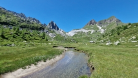 Devant nous, l’Alpe Campolungo, et une vaste zone plane marécageuse, traversée par un ruisseau qui prend ses aises et progresse via de grands méandres. Sur notre gauche, un pic vert de végétation, un autre blanc comme neige et en face un éperon strié de gris. 50 shades of grey.