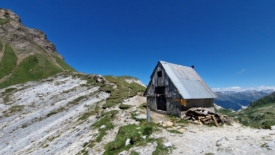 Au col, une vieille cabane se dresse, fermée et à l’abandon. Un pan de tôle, battu par le vent, tape sourdement contre un mur, tel un métronome.