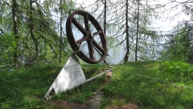 Une vieille roue de téléphérique est exposée au bord du chemin. Construite entre 1883 et 1886, le téléphérique permettait de transporter des passagers mais aussi, à la fin du printemps, de descendre de la glace extraite du lac, glace qui était ensuite transportée par train et vendue à Milan, Côme et Lugano.